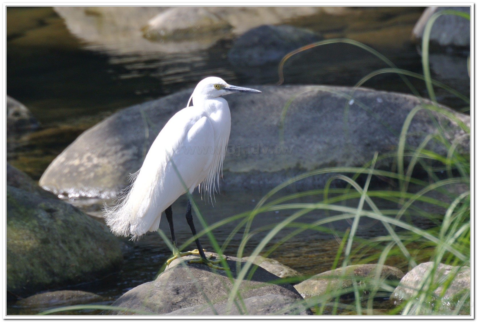 特徵描述:全身羽色雪白而修長,外型高貴典雅,身長約61公分。嘴、腳皆為黑色,腳趾為明顯的黃綠色。繁殖期眼先轉為紅色,頭、枕部後方有兩根長飾羽,長度可達21.5公分,背部、前頸下部長有簑狀飾羽,蓑羽13-49根不等,且略為上捲;非繁殖期則無飾羽。小白鷺老鳥的腳趾帶暗紅色,腳踝的黃斑大小都不一樣。