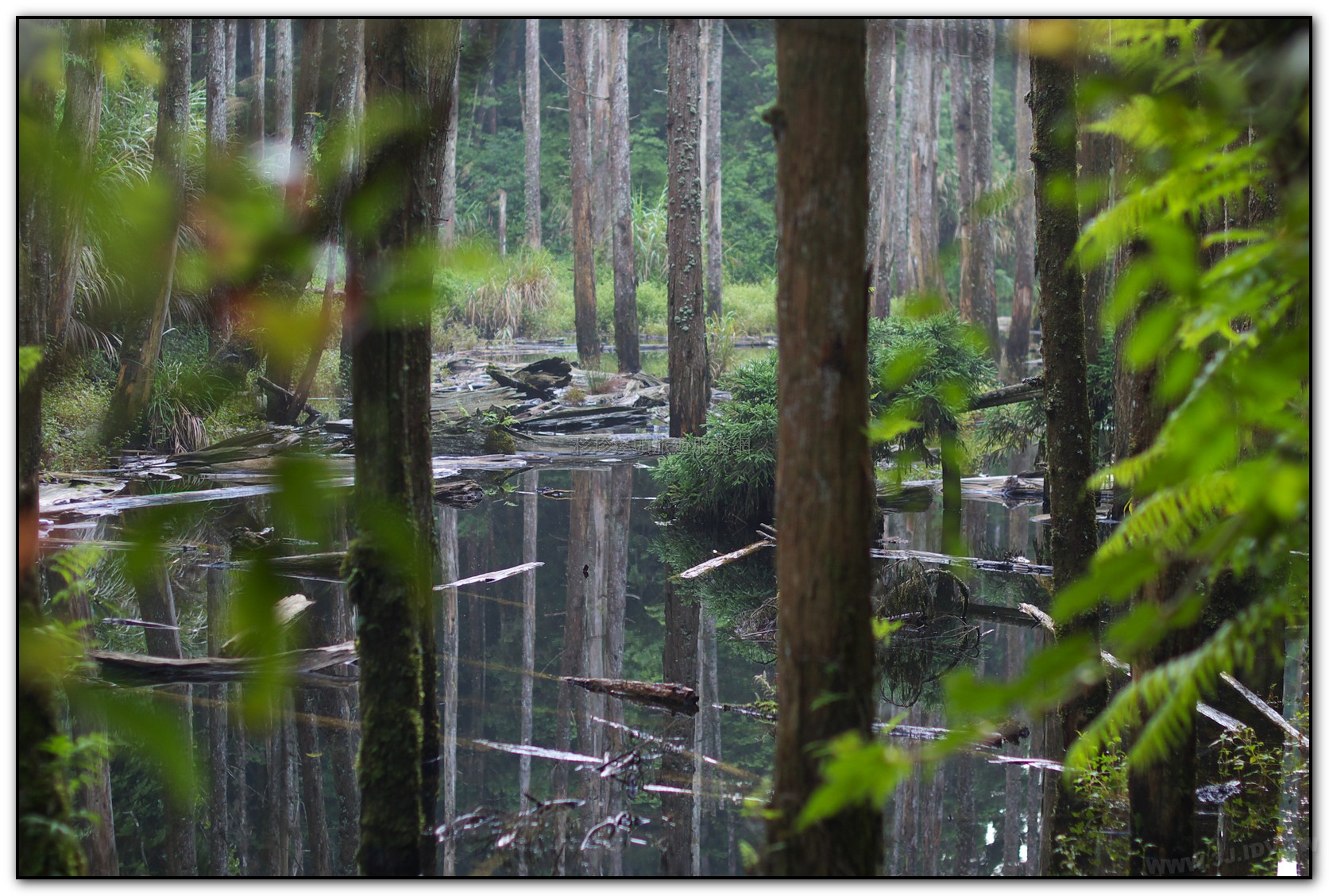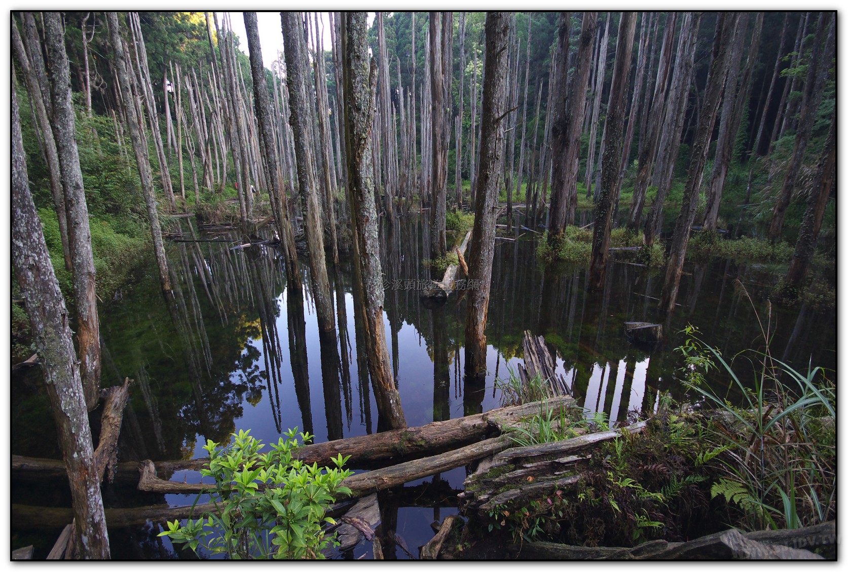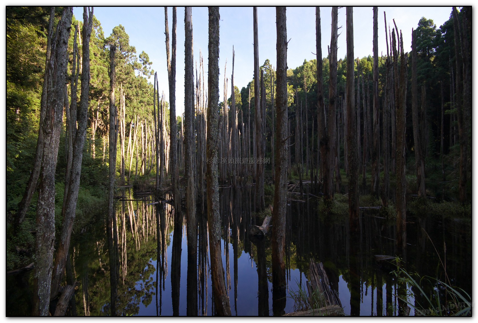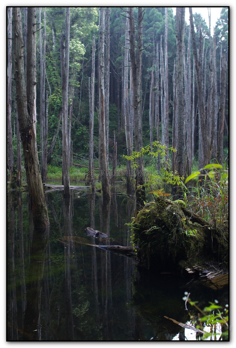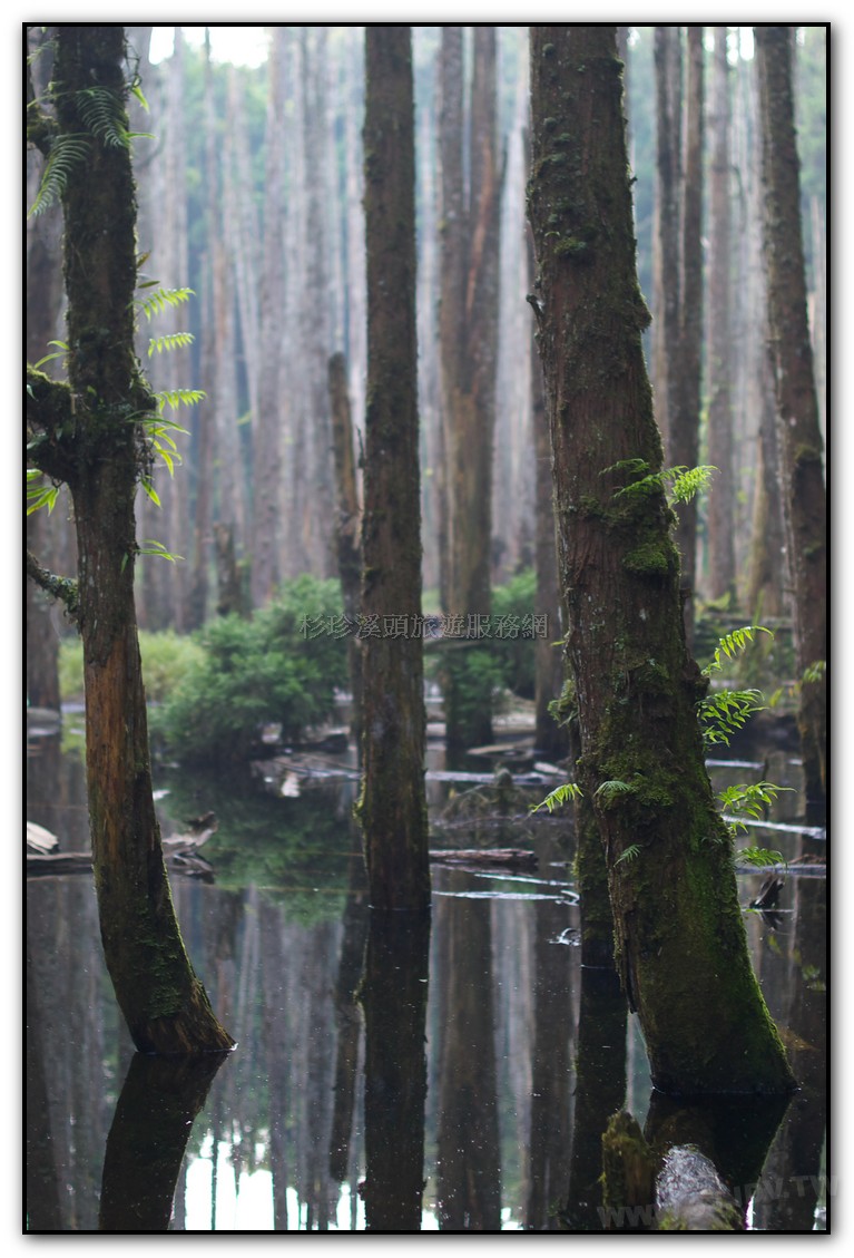 「忘憂森林」是921大地震後形成的淤積沼澤, 杉木林長期泡水而枯死,形成特異景觀,腹地不大,約 1.5個足球場的面積(長型),當地的地名叫草?仔,「?」 就有沼澤或泥漿地之意,國語唸ㄉㄧ\,台語唸LAM或 LOM,就是腳踩會陷下去的意思;當地的山友俗稱為枯 木林。忘憂森林路段很徒,用走的約30-40分,蠻費體力的,如果不想步行,入口處有接駁車可搭。